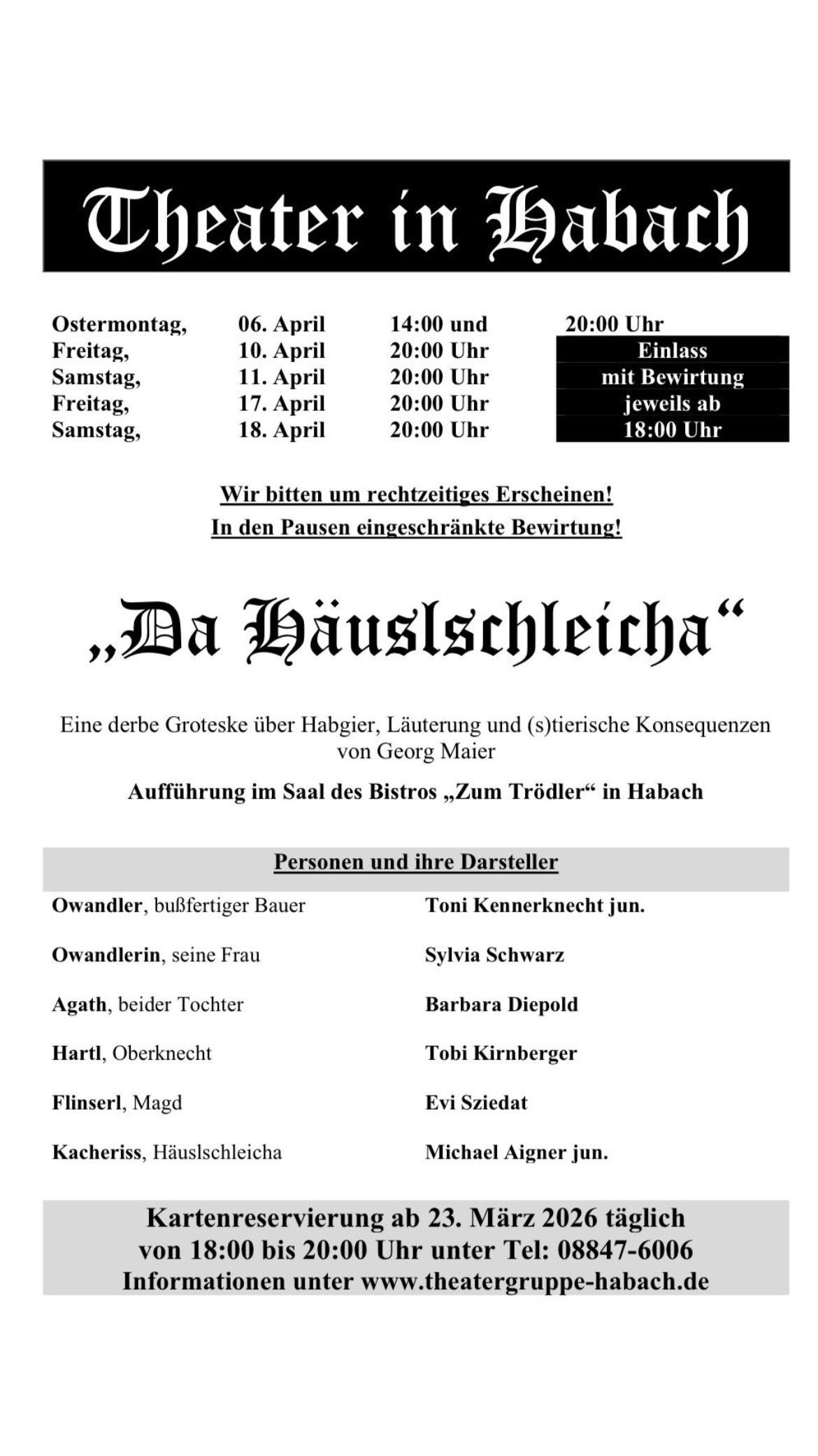 Kartenreservierung ab 23. März 2026 täglich von 18:00 bis 20:00 Uhr unter Tel: 08847 - 6006